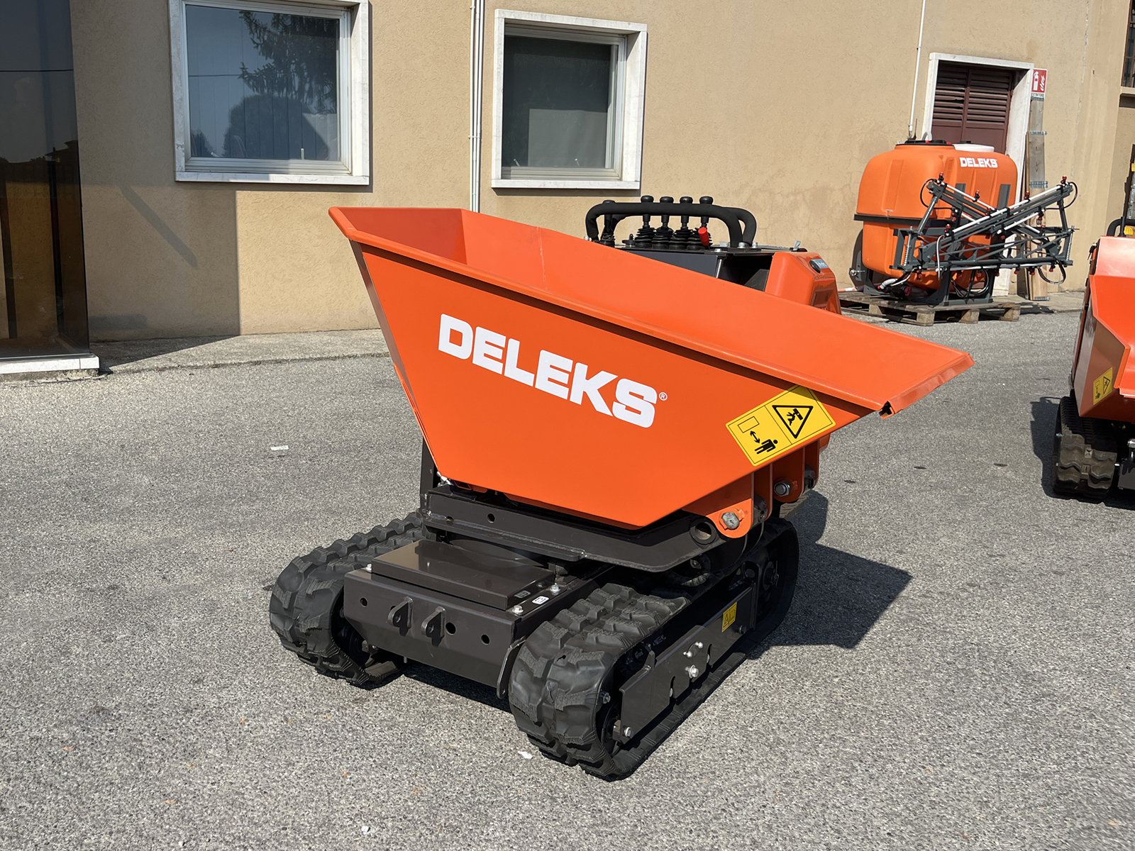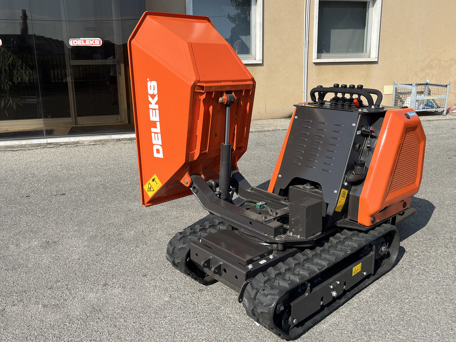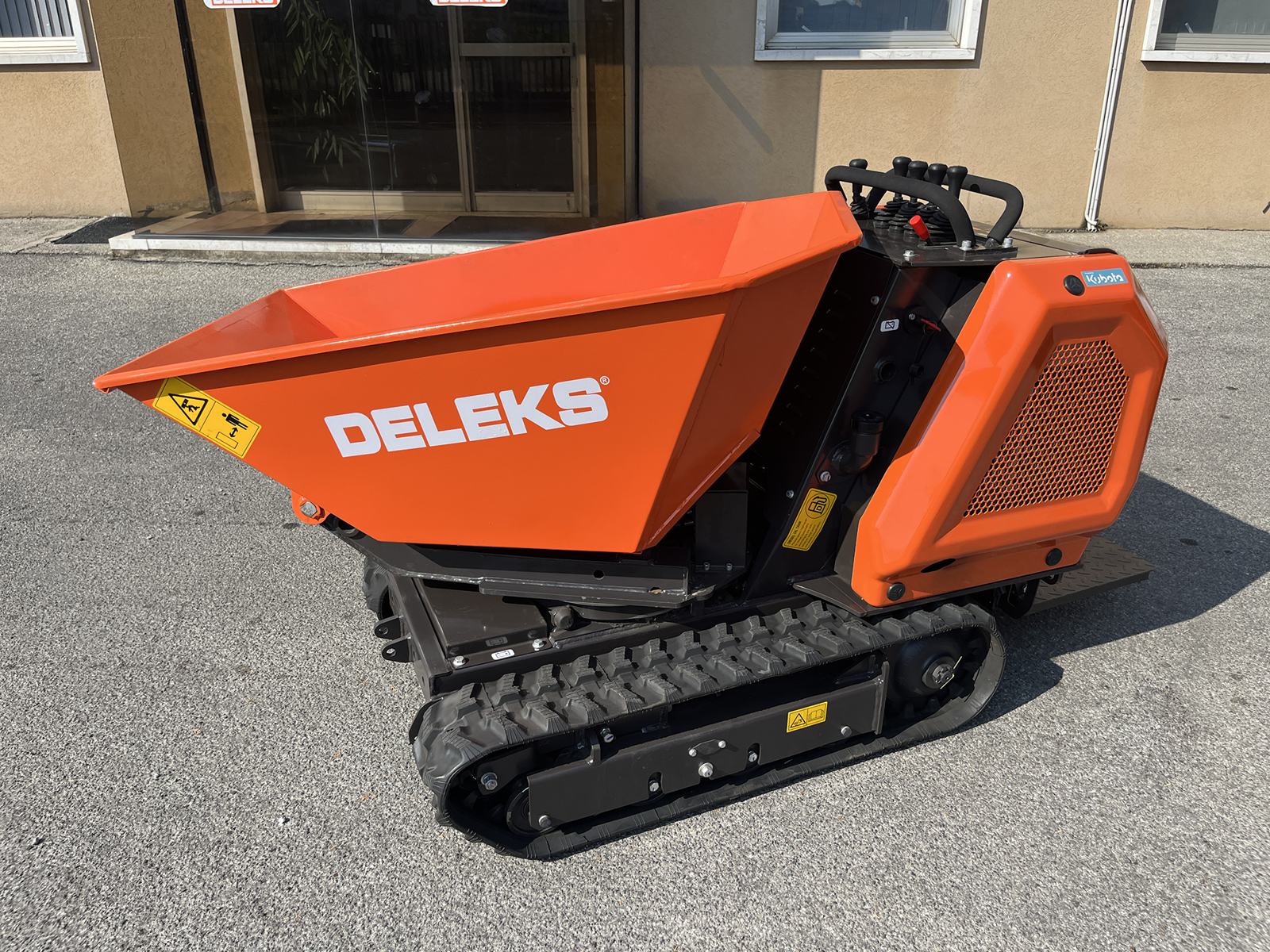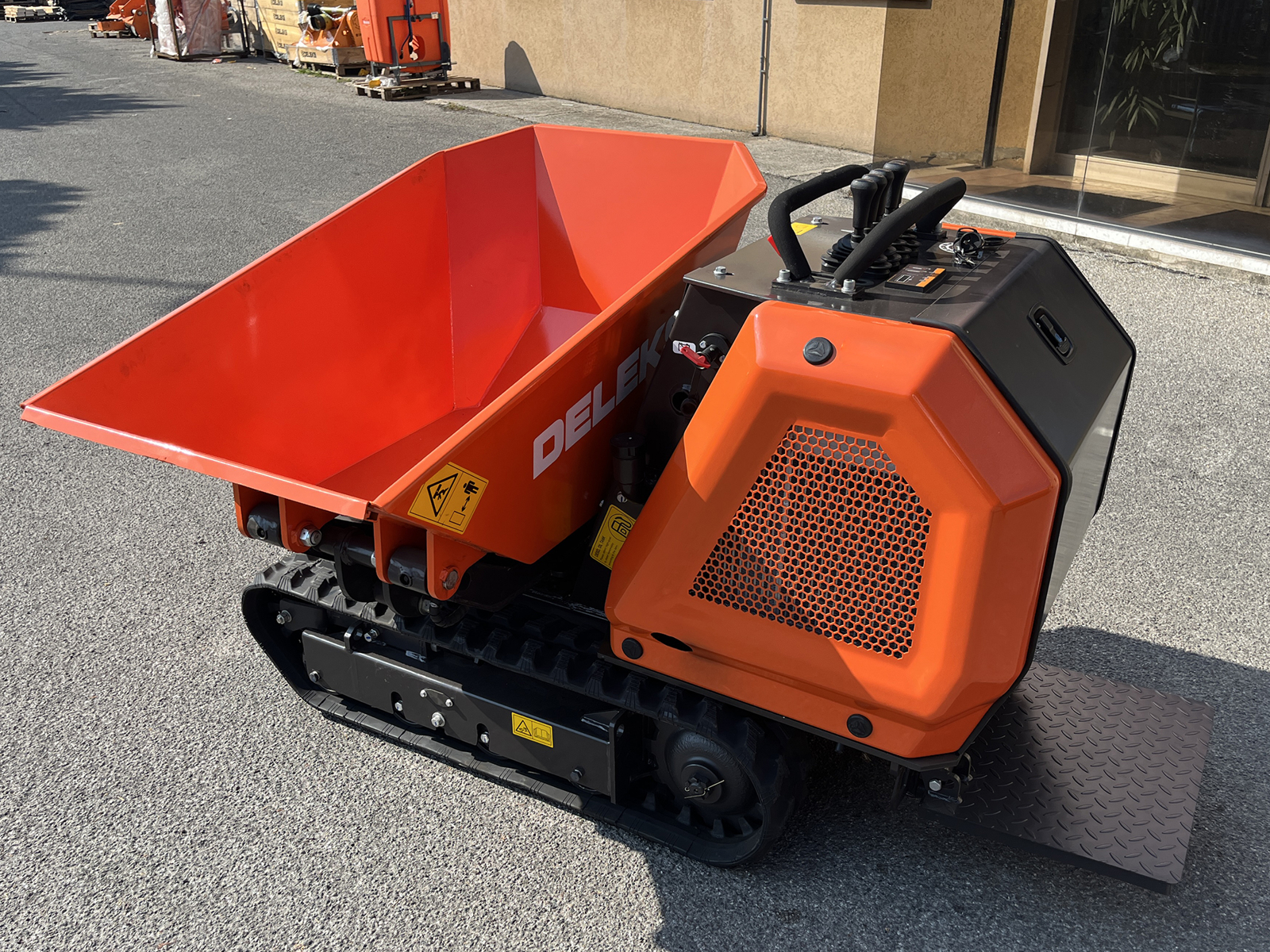 DELEKS® M8000R-BS professioneller Raupen-Minidumper mit dreiseitiger Entladung über 180°, hydraulischem Heben und Drehen der Mulde, hydrostatischem Antrieb, Fahrerplattform und Briggs & Stratton-Motor mit elektrischem Start.