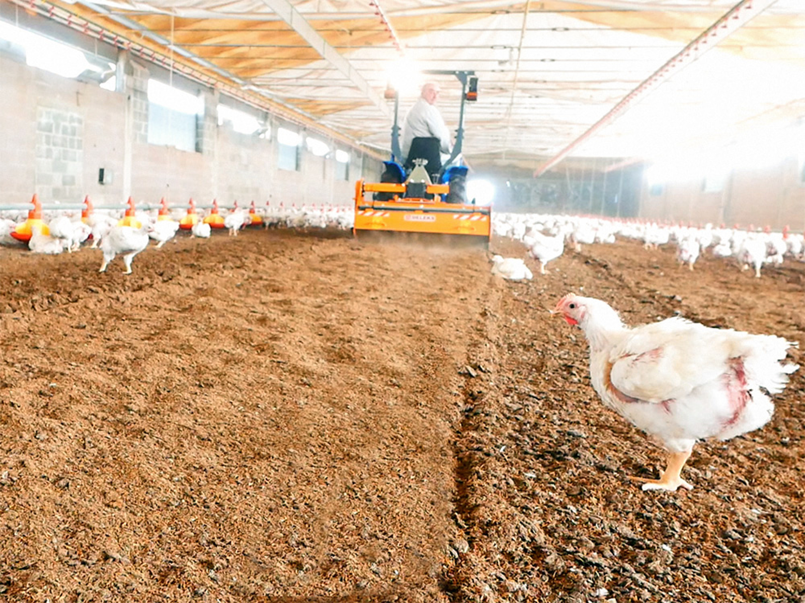 Le sue zappe miscelano e rivoltano tutti gli strati della lettiera e distribuiscono i trucioli asciutti in superficie.