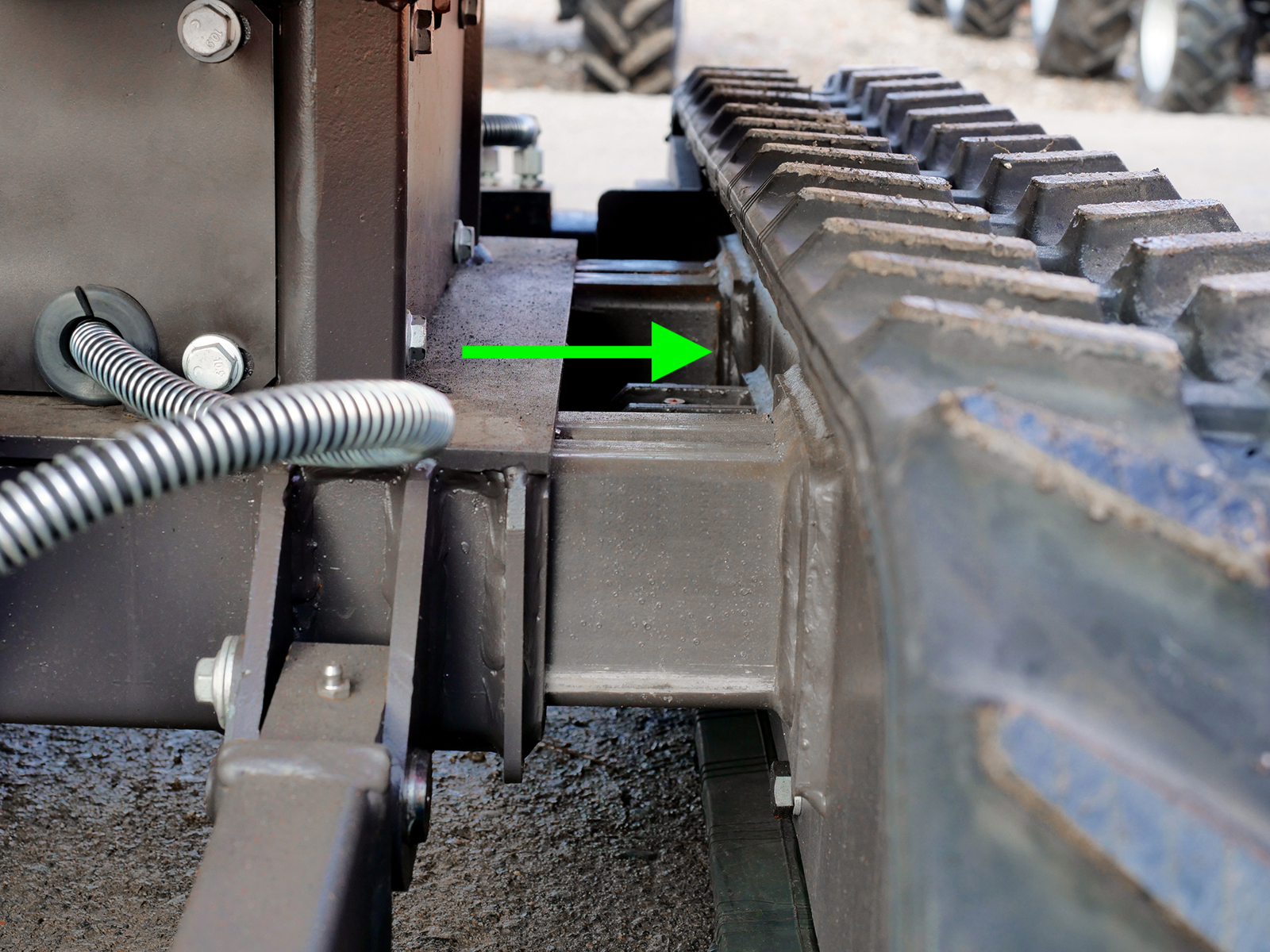 Le châssis à voie variable assure une stabilité optimale sur terrain irrégulier, tandis que le bras déportable augmente la productivité dans les zones difficiles d’accès.