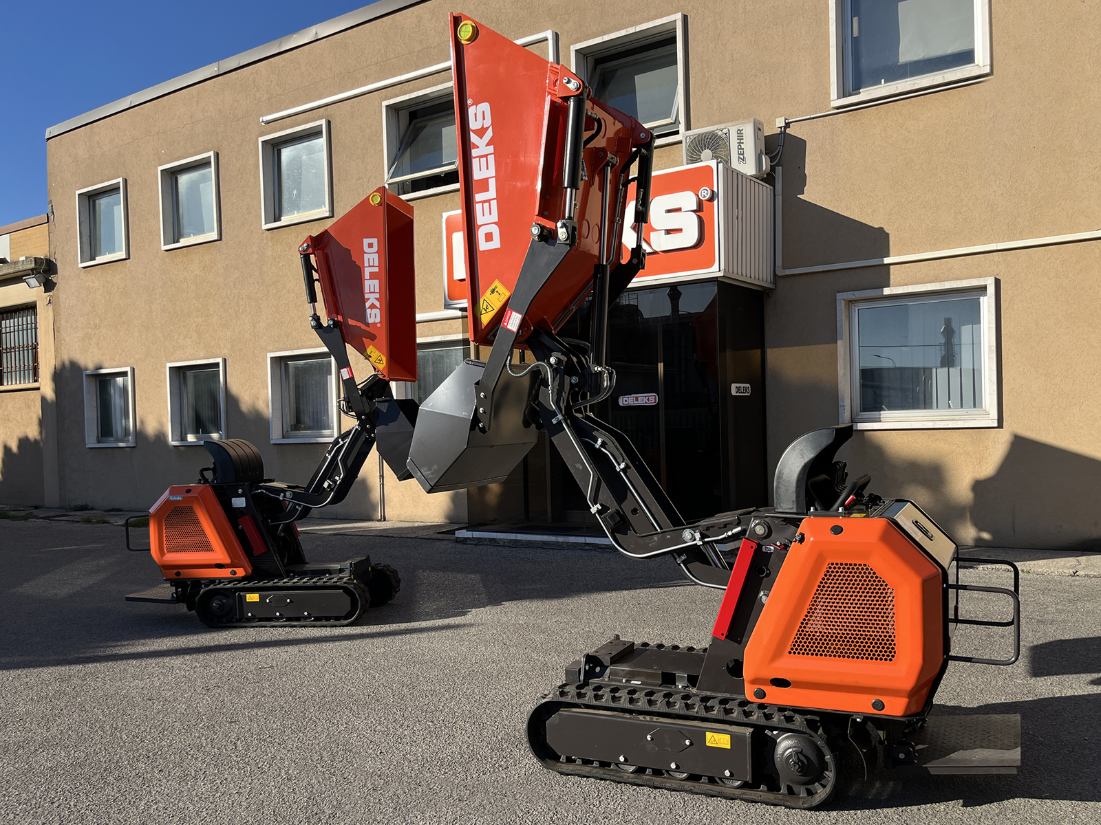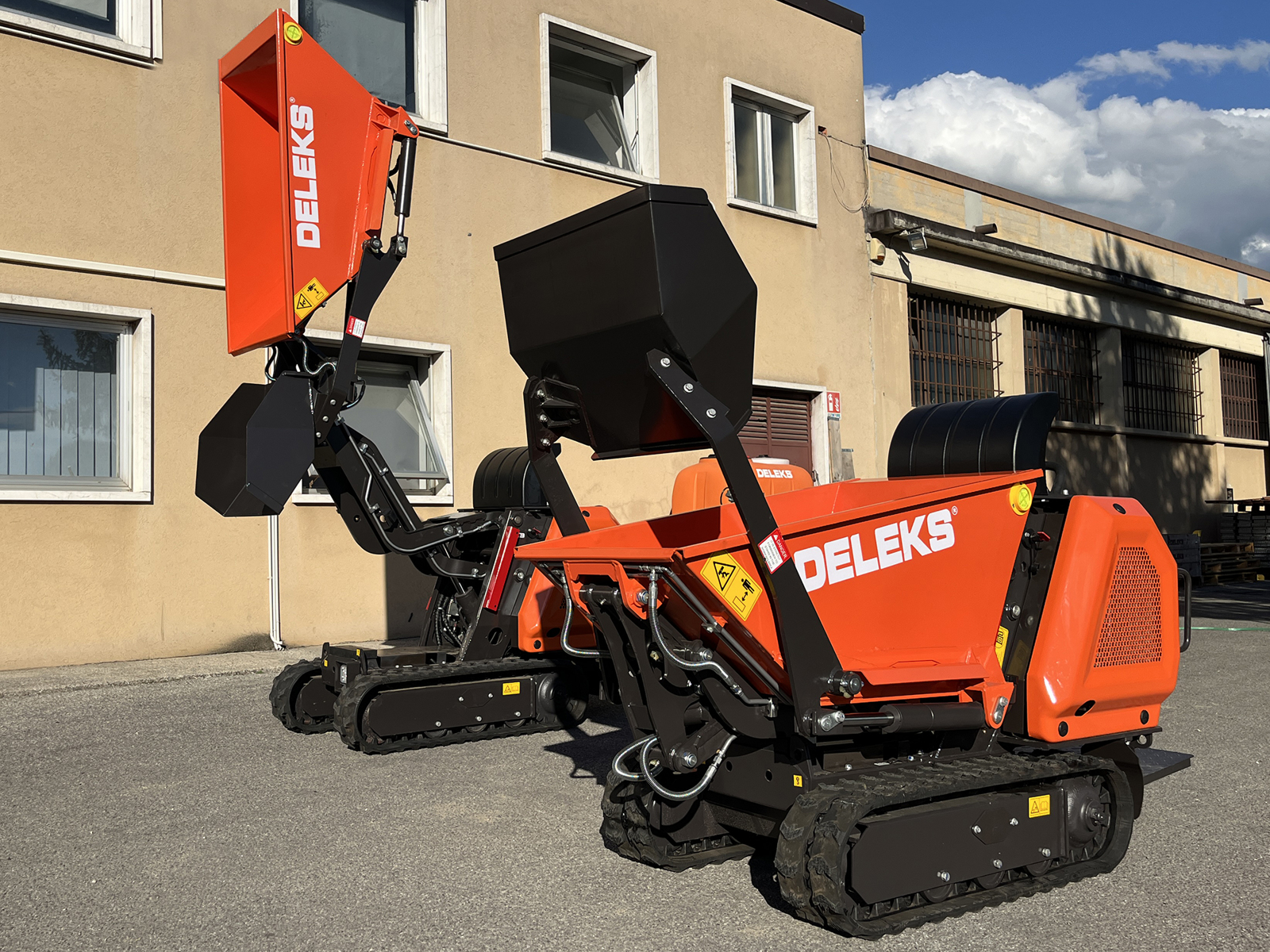 Mini dumper chenillé professionnel DELEKS® M8000-BS avec système autochargeant, benne à déversement en hauteur, transmission hydrostatique, plateforme opérateur et moteur Briggs & Stratton avec démarrage électrique.