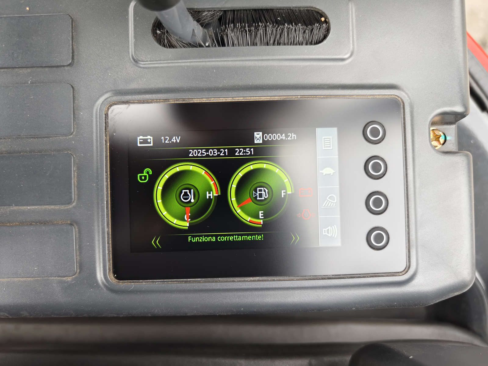 Équipement standard : moteur Kubota D902, bras orientable, châssis extensible, double vitesse, godet 43 cm, lame frontale, circuit hydraulique auxiliaire (pour tarière ou marteau), toit panoramique 360°, écran LCD en français, trois filtres Kubota d’origine (air, huile, carburant), boîte à outils.