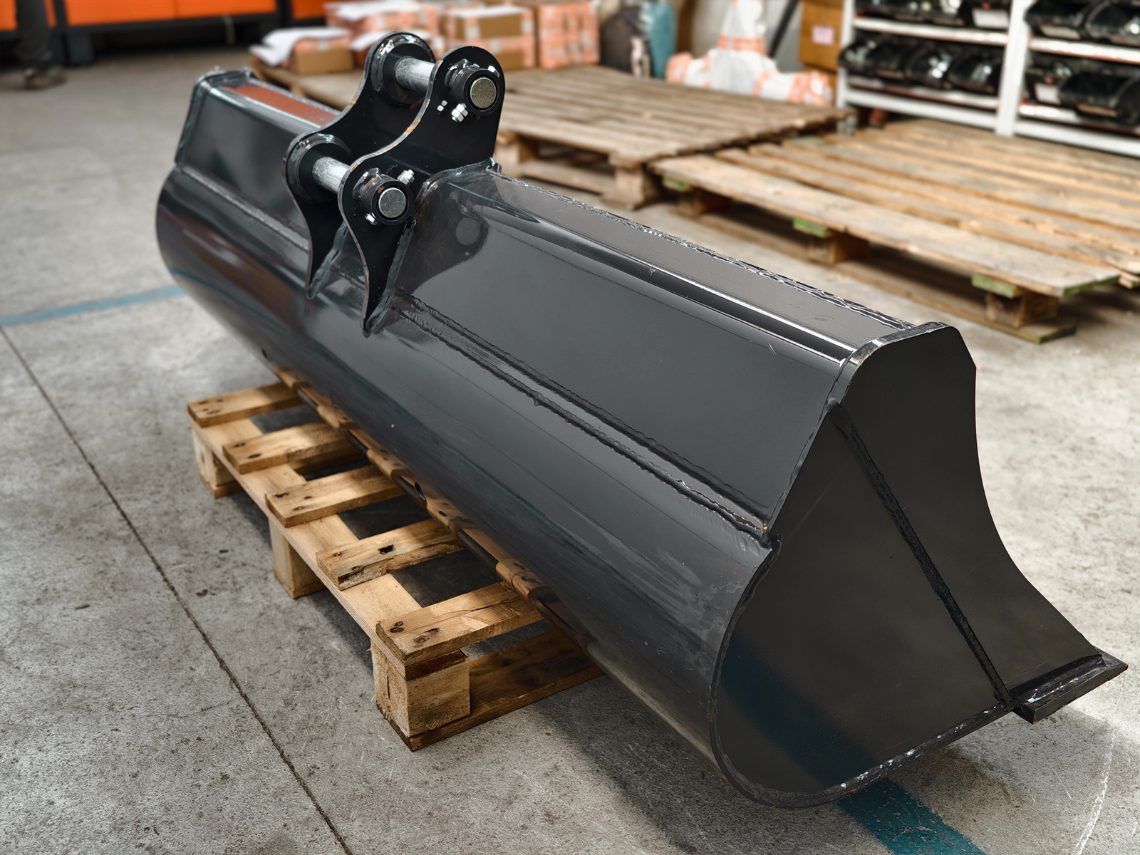 Godet large DELEKS® de 150 cm pour minipelles avec attache S280, livré avec 2 axes de fixation.