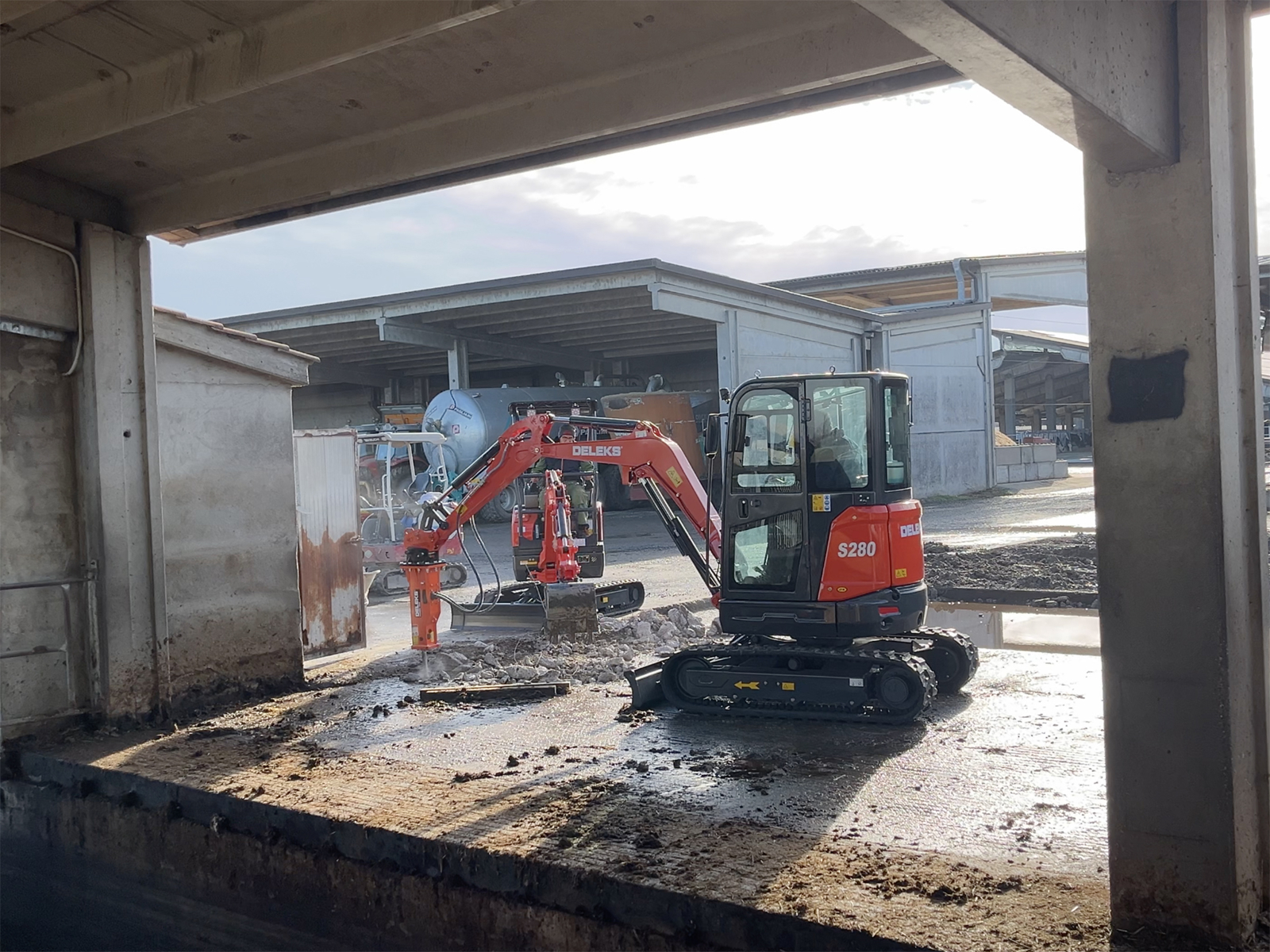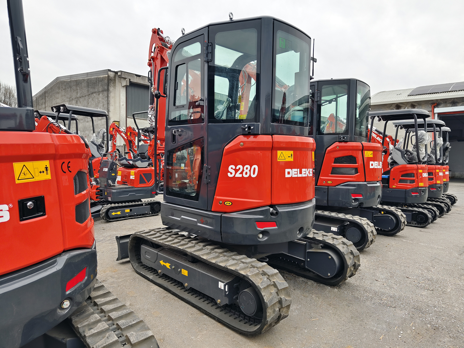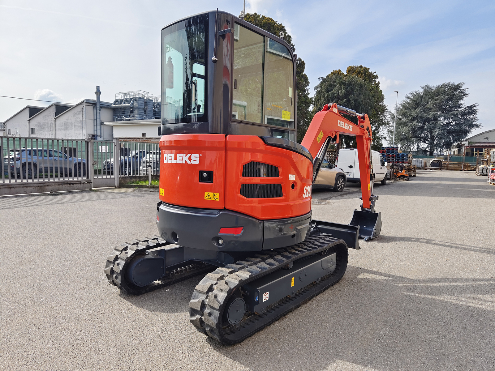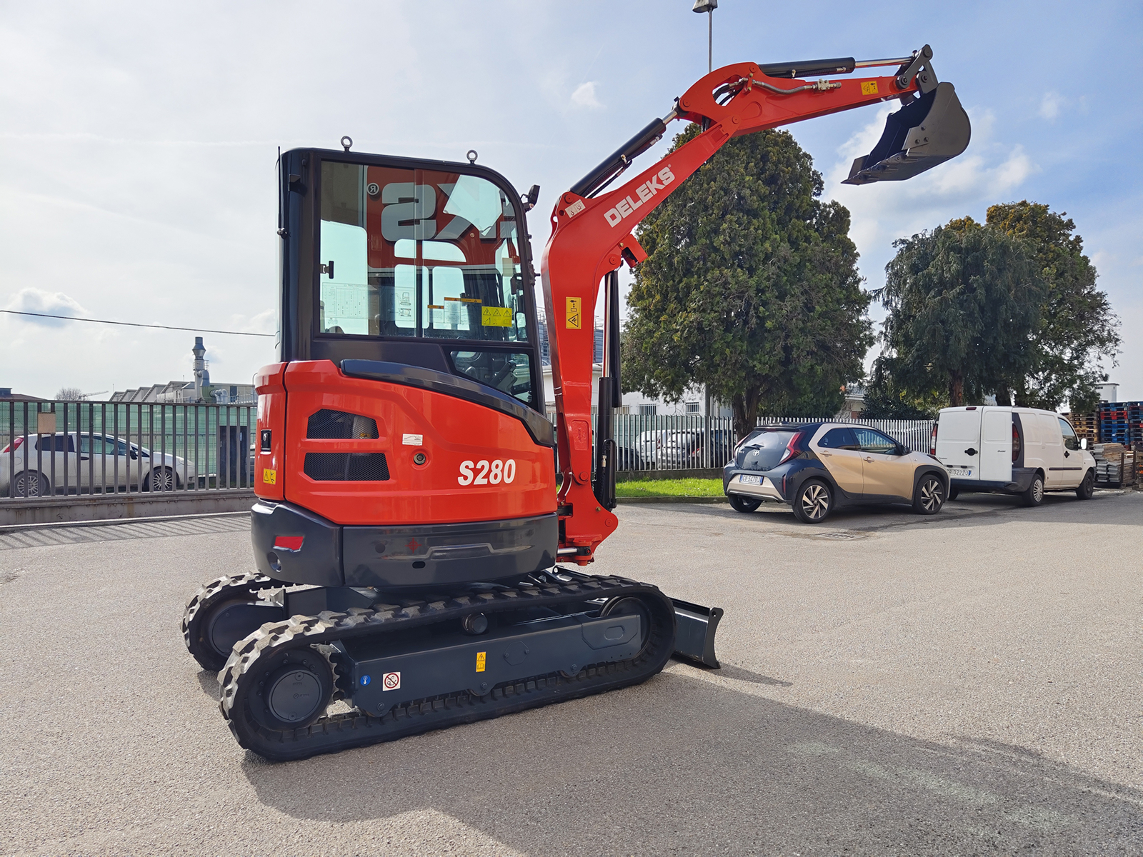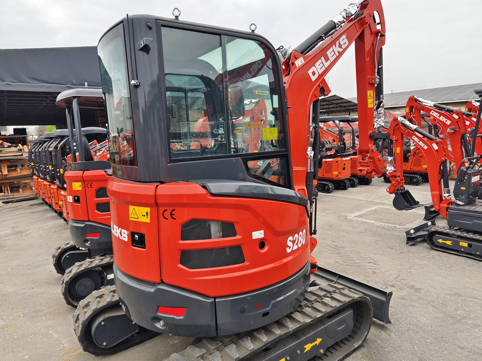 Mini-pelle cabine DELEKS® S280CK 2.8 t, équipée d’un moteur Kubota D1105 Stage V à 3 cylindres (1123 cc), cabine chauffée, bras déporté et double vitesse de déplacement jusqu’à 4 km/h.