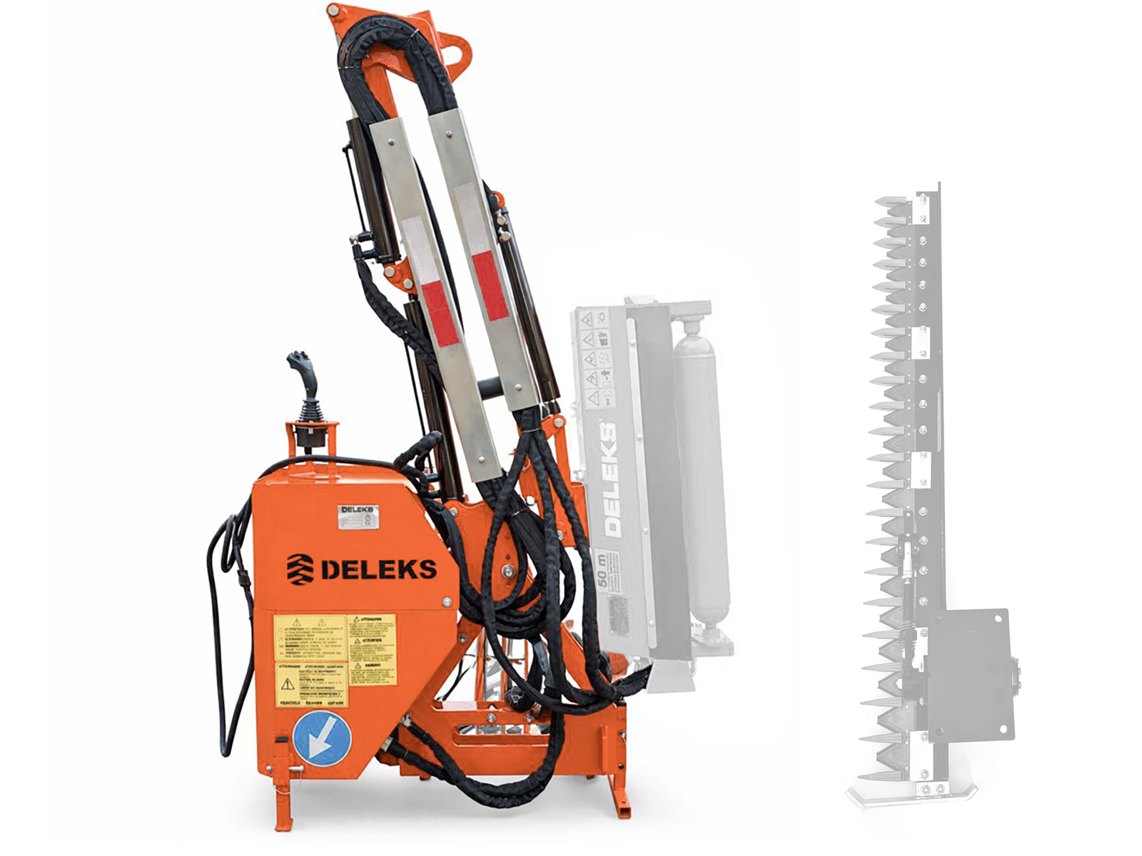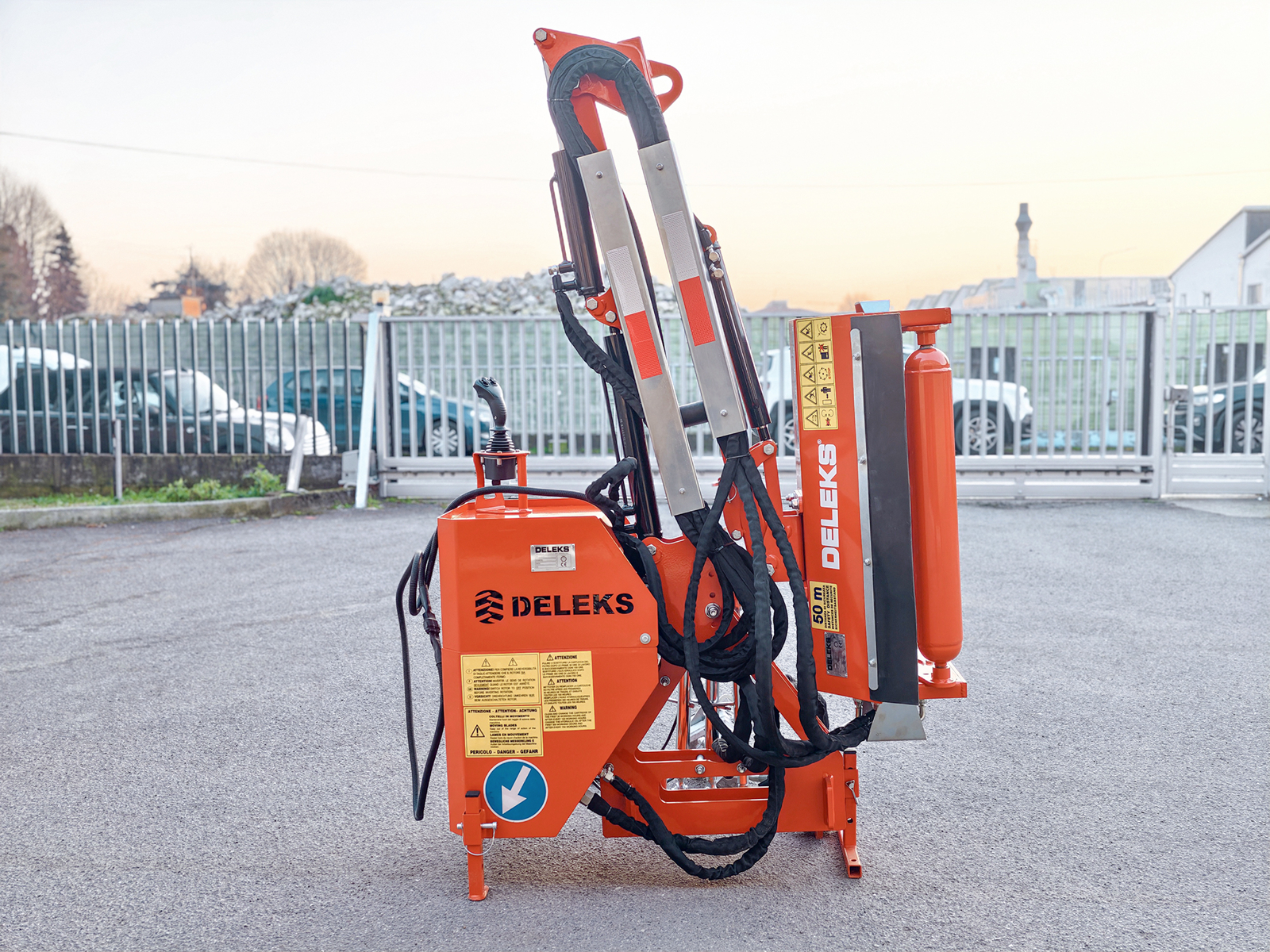 Bras débroussailleuse hydraulique porté DELEKS® AIRONE, Épareuse hydraulique portée compatible avec tracteurs à relevage 3 points Cat. 1, prévu pour têtes de broyage de 60–80–100 cm ou barres taille-haies de 130–160–180 cm. Joystick de commande et pompe PTO inclus.