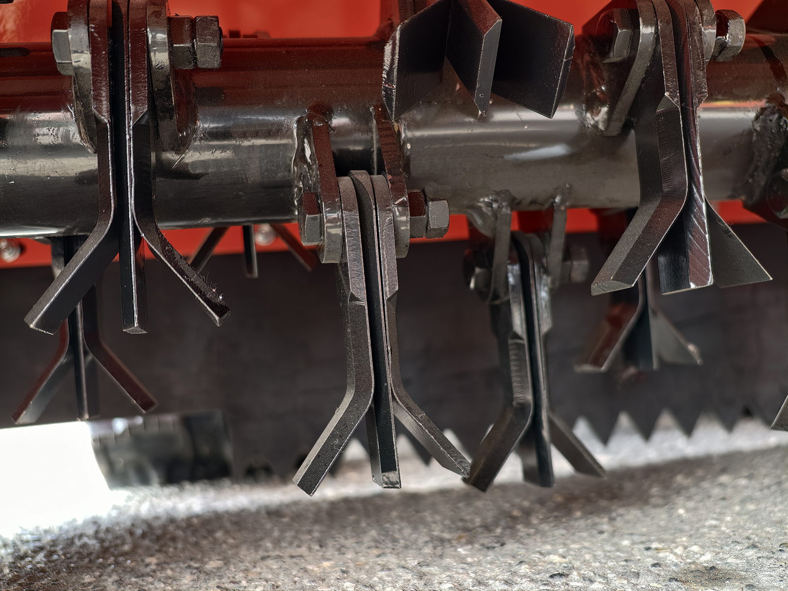 Le système de broyage est basé sur un rotor à haute inertie équipé de 22 groupes de couteaux, chacun composé de 3 éléments (2 couteaux courbés et 1 couteau central droit), pour un total de 66 couteaux. Cette configuration garantit une capacité de coupe supérieure et une meilleure qualité de broyage sur l’herbe, les broussailles et les petits résidus ligneux. Le système de couteaux flottants réduit le risque d’endommagement du rotor en cas de chocs accidentels contre des pierres ou des corps étrangers. La transmission est assurée par un système à double courroie, offrant une meilleure fiabilité et une distribution de puissance plus efficace par rapport aux systèmes à courroie unique.