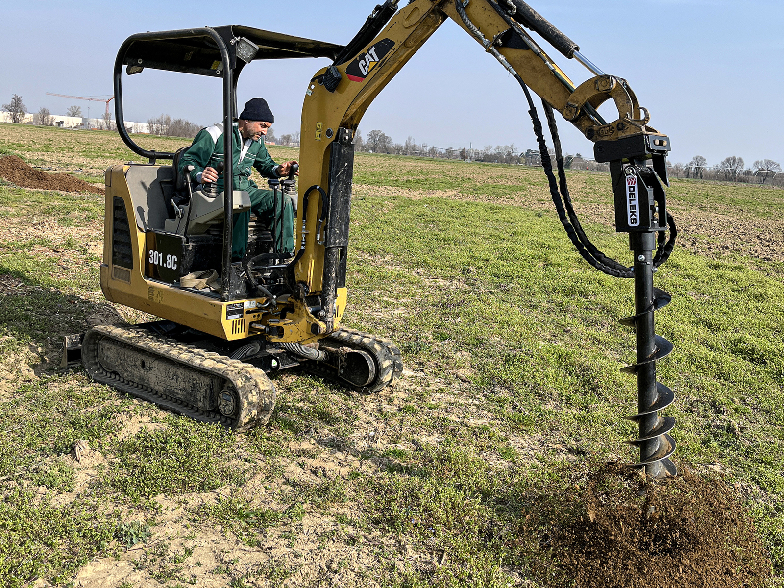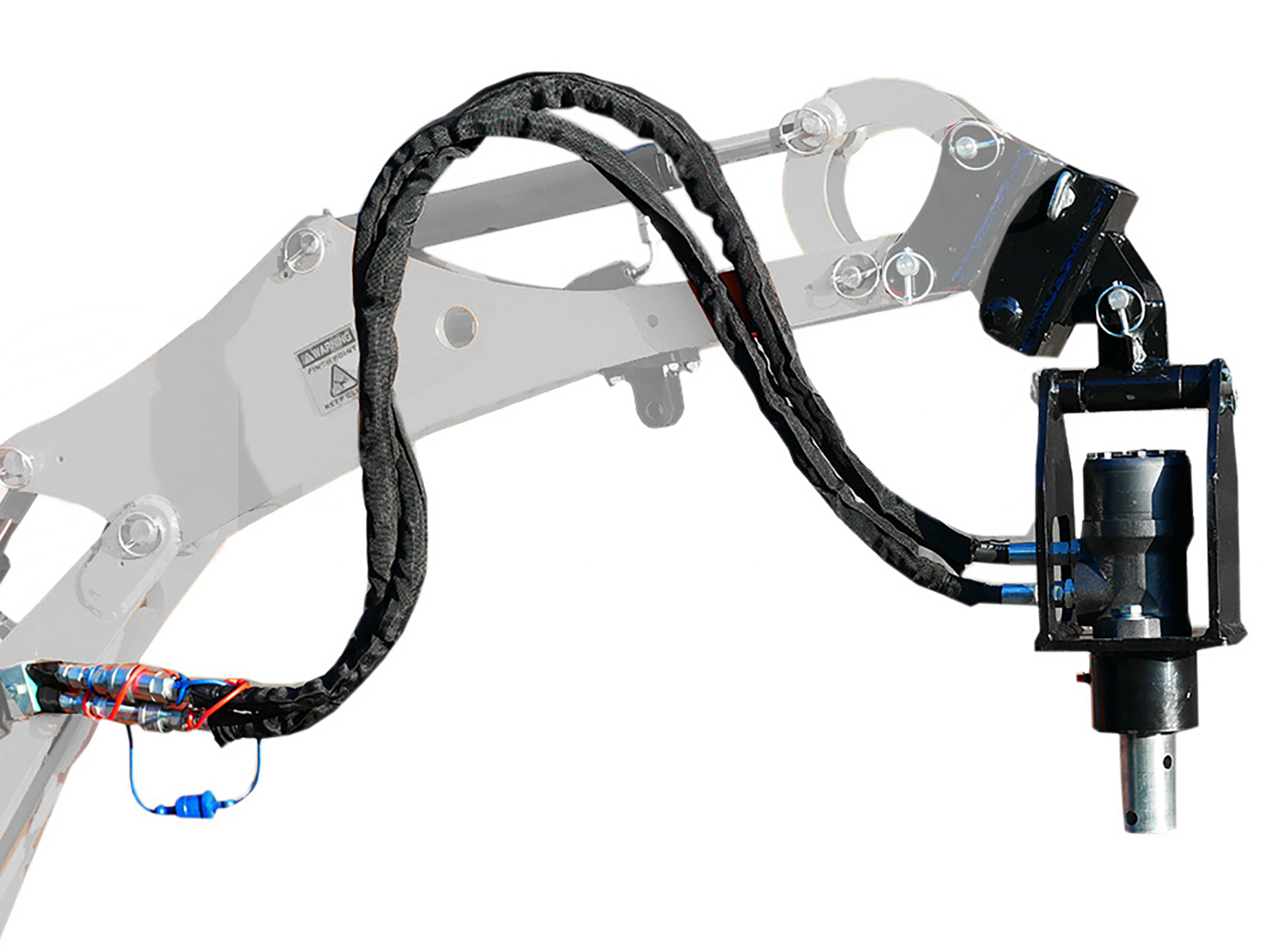 La tarrière / Rotateur hydraulique DELEKS® GRHD-200 convient pour les mini-pelles, chargeuses sur pneus ou chargeuses frontales.