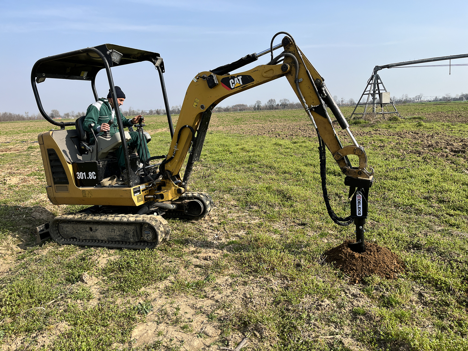 Entraînement de la tarrière: hydraulique via une mini-pelle, une chargeuse sur pneus, un tracteur, etc.