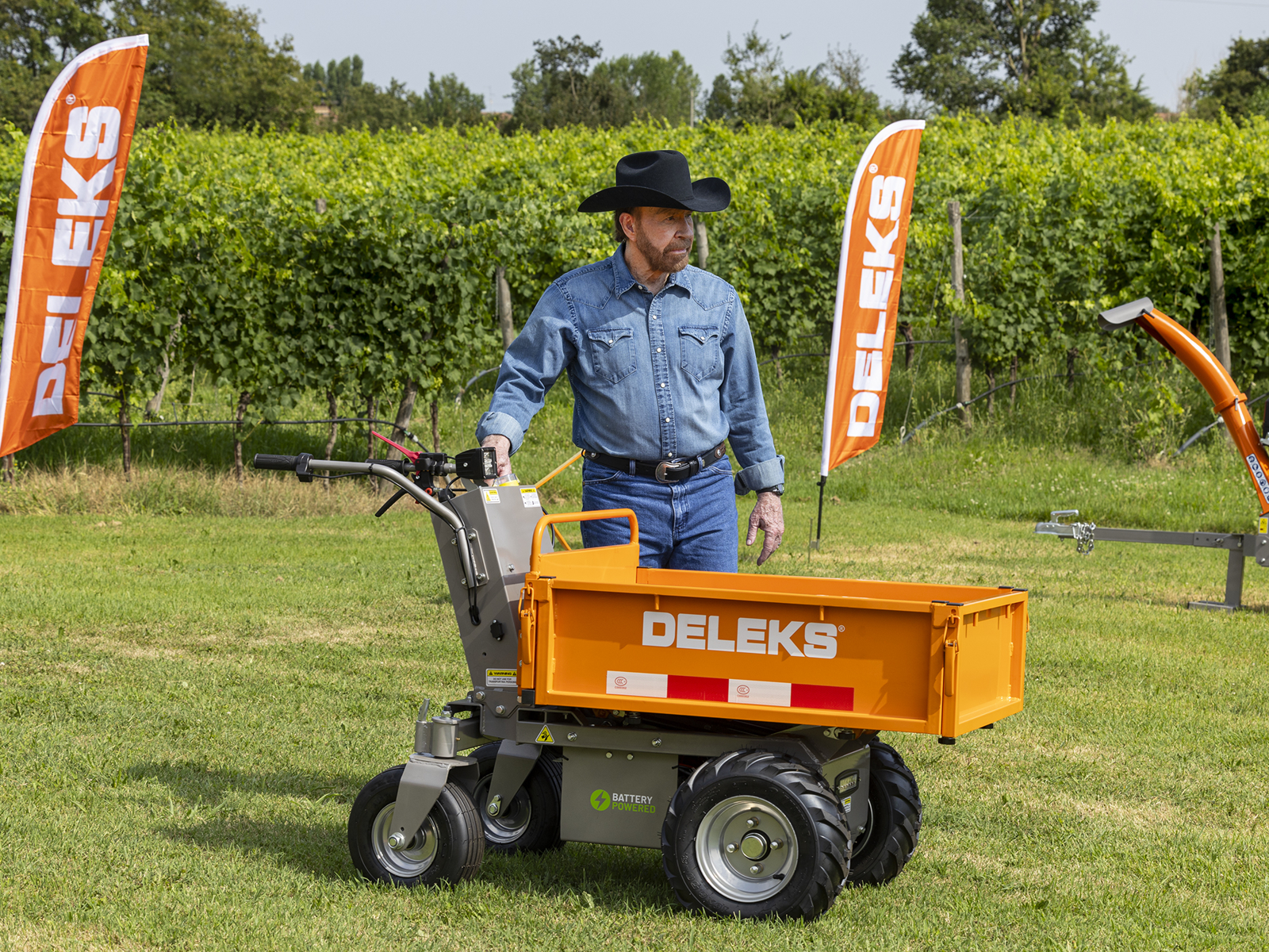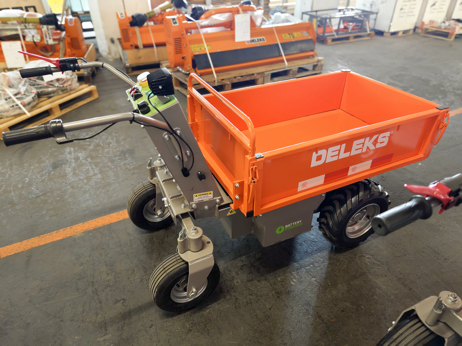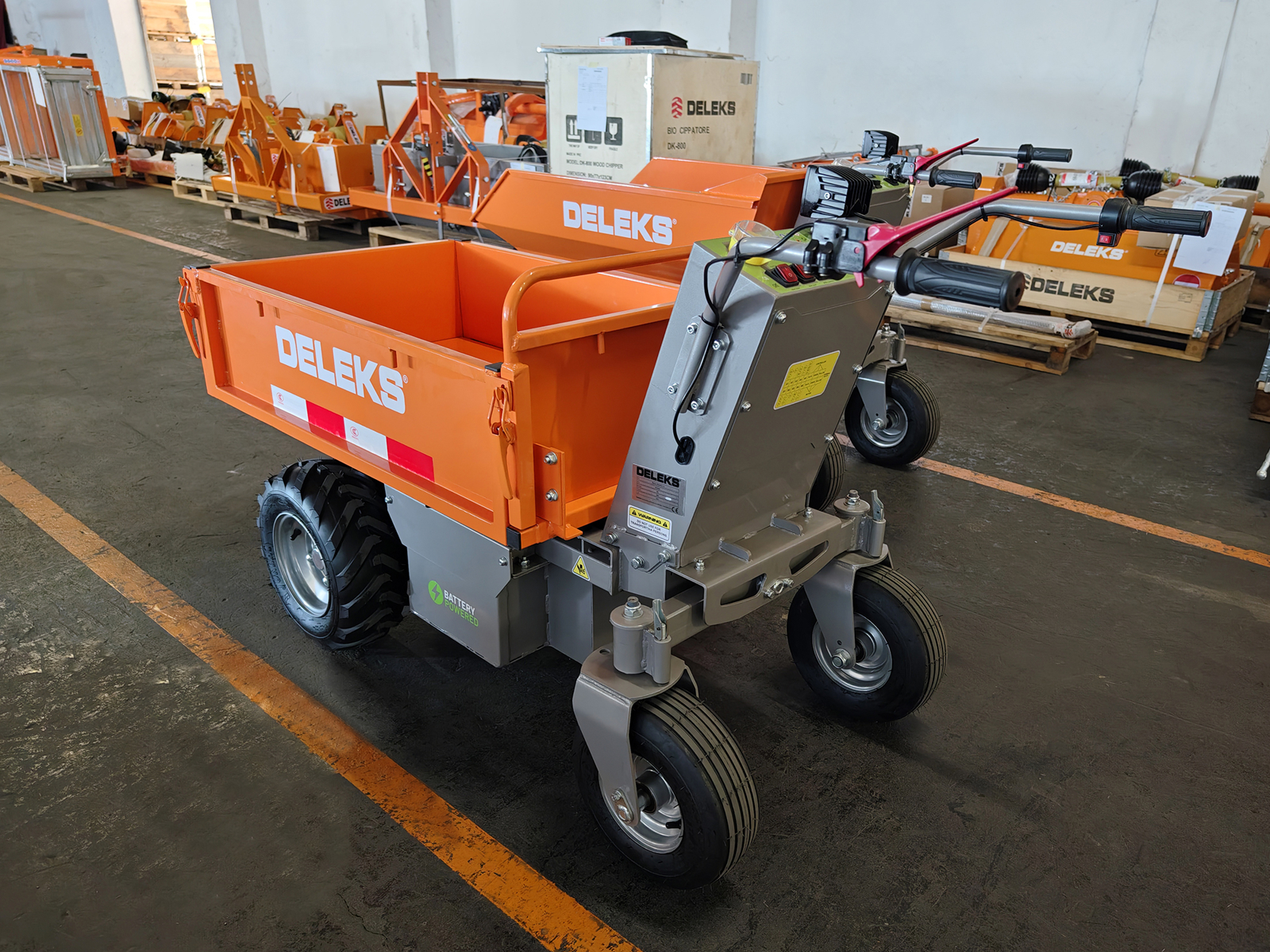 Questa motocarriola DELEKS® con motore elettrificato può trasportare un carico di 500 kg, non emette alcun rumore, è quindi ideale in ambito paesaggistico, edilizio, nei maneggi, nelle serre o nelle stalle, per il trasporto di materiale vario, ma soprattutto legname.