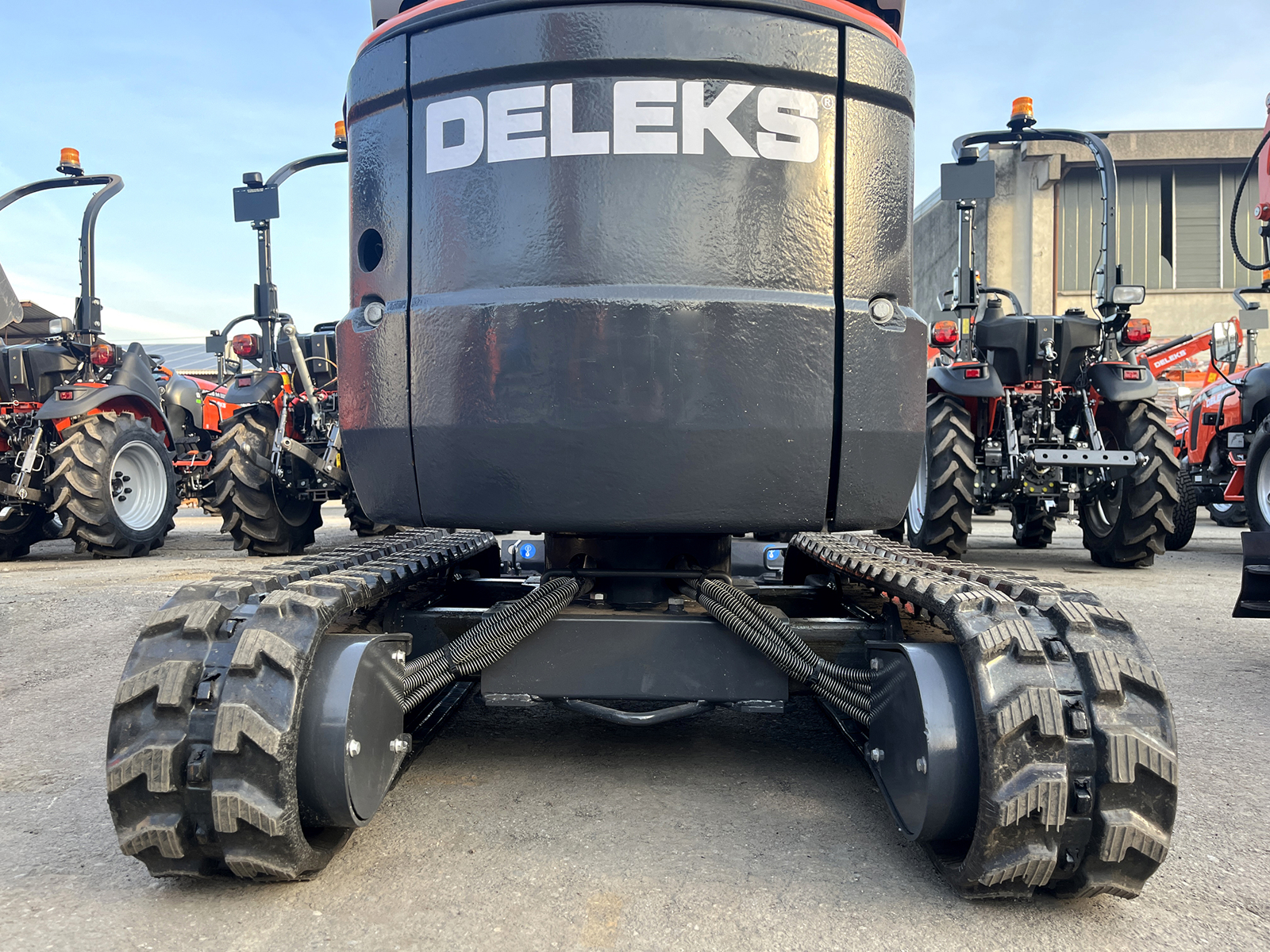 FERMERLa mini-pelle compacte DELEKS® S100 à déport arrière nul, équipée d’un moteur diesel Kubota D722 à 3 cylindres, d’un distributeur hydraulique et de joysticks latéraux Made in Italy, d’un châssis extensible et d’une double vitesse commandée par pédale gauche, offre un équilibre parfait entre puissance, précision et confort d’utilisation.