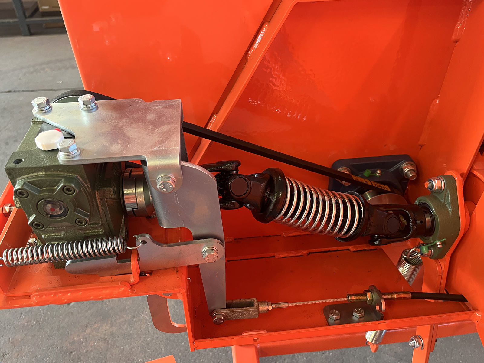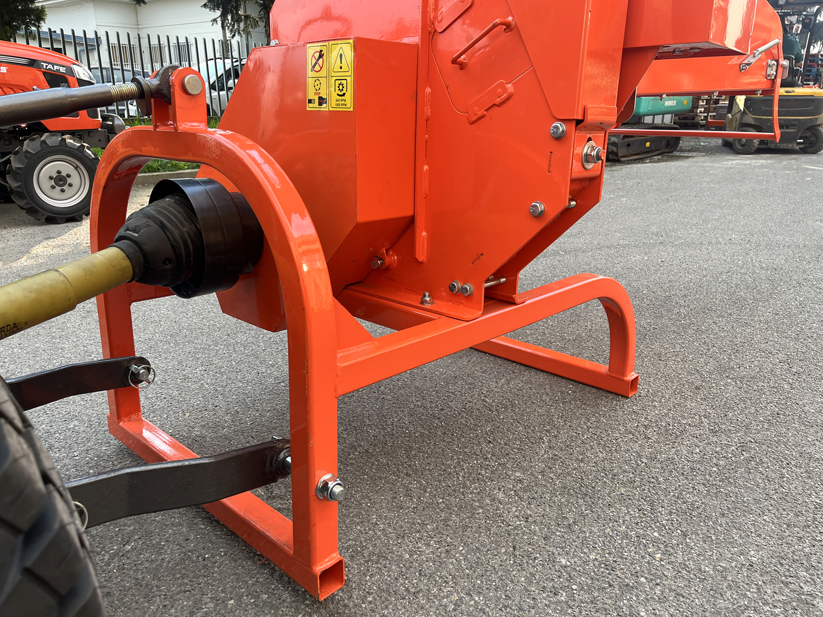La machine fonctionne via la prise de force du tracteur et utilise un disque de broyage en acier de forte inertie, garantissant une coupe régulière et un fonctionnement continu.