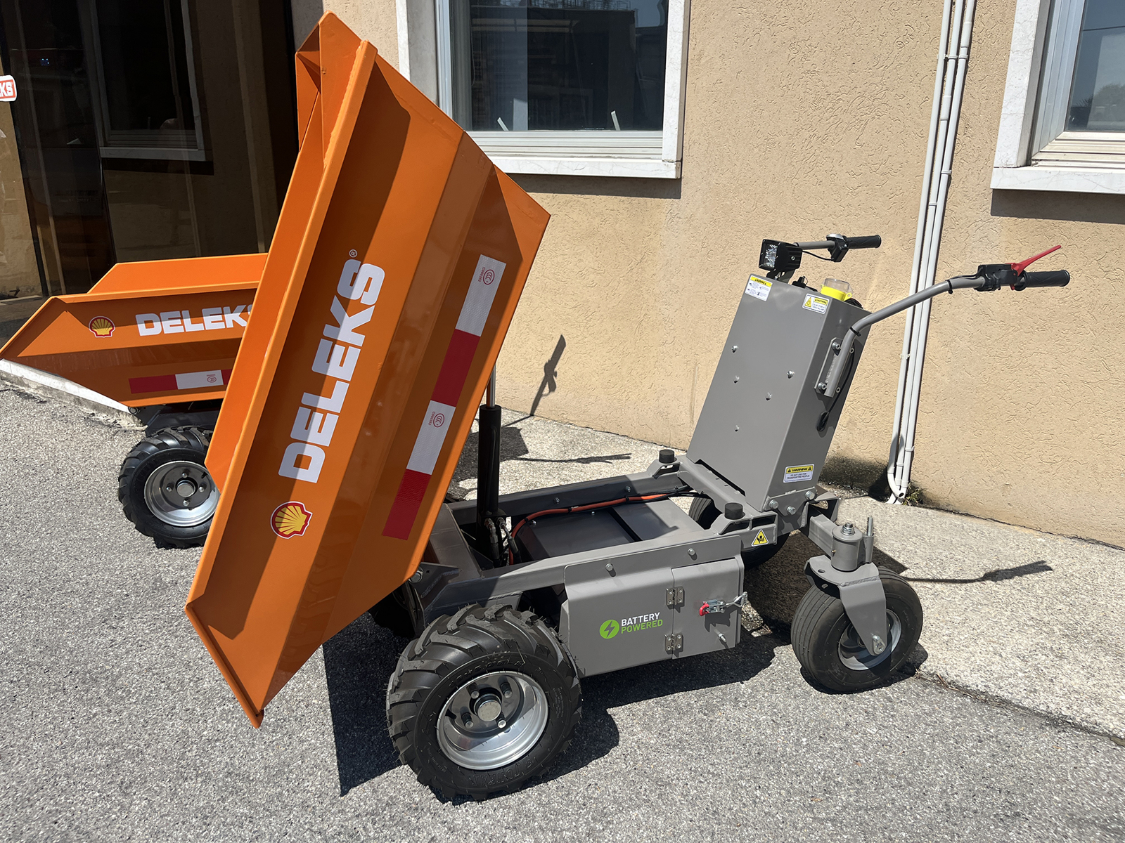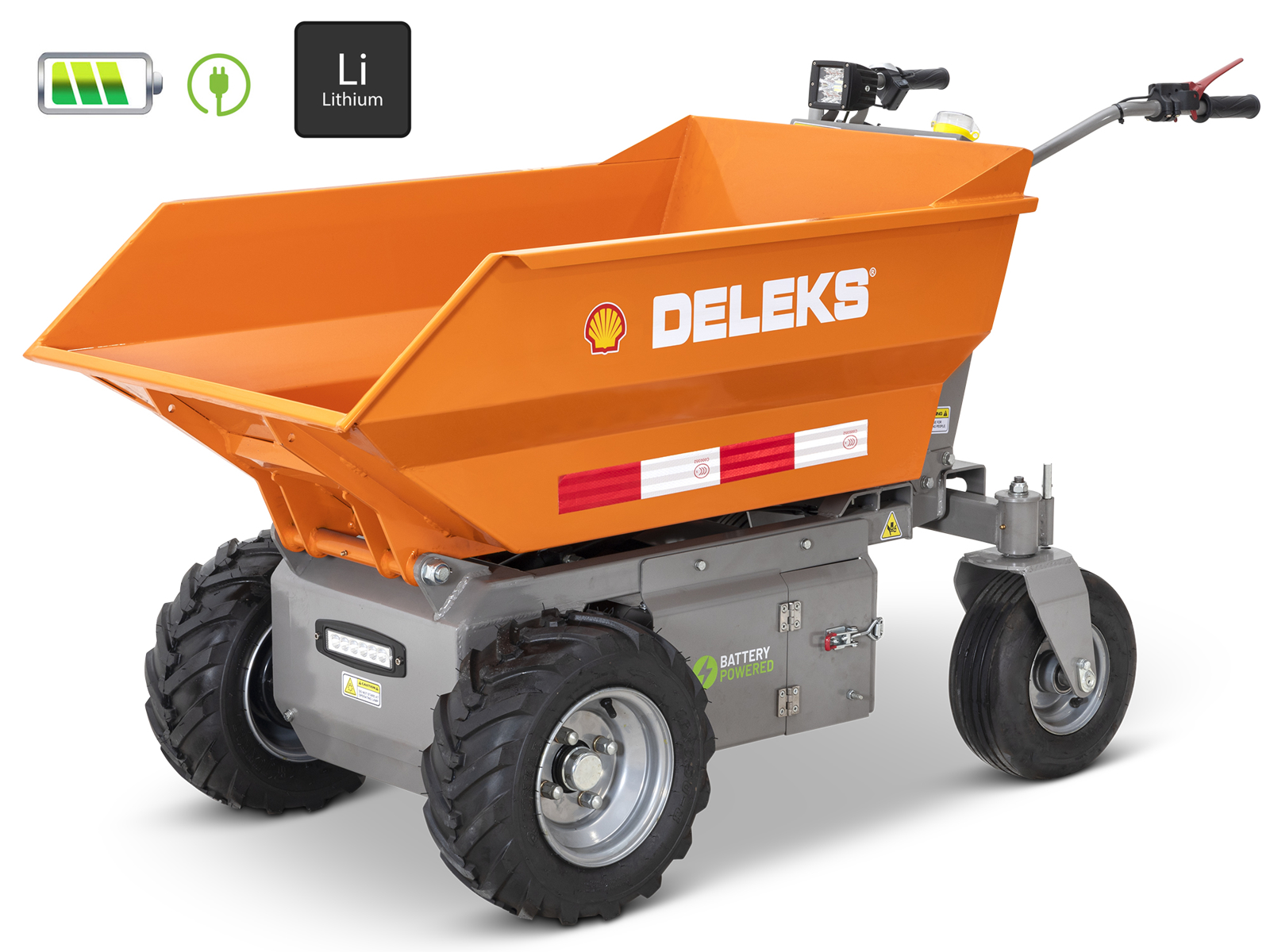Motocarriola elettrificata DELEKS® XE-500He Lithium Minidumper con motore elettrico, batteria al litio 48V 60Ah removibile, ribaltamento idraulico, cassone dumper, carico 500kg.