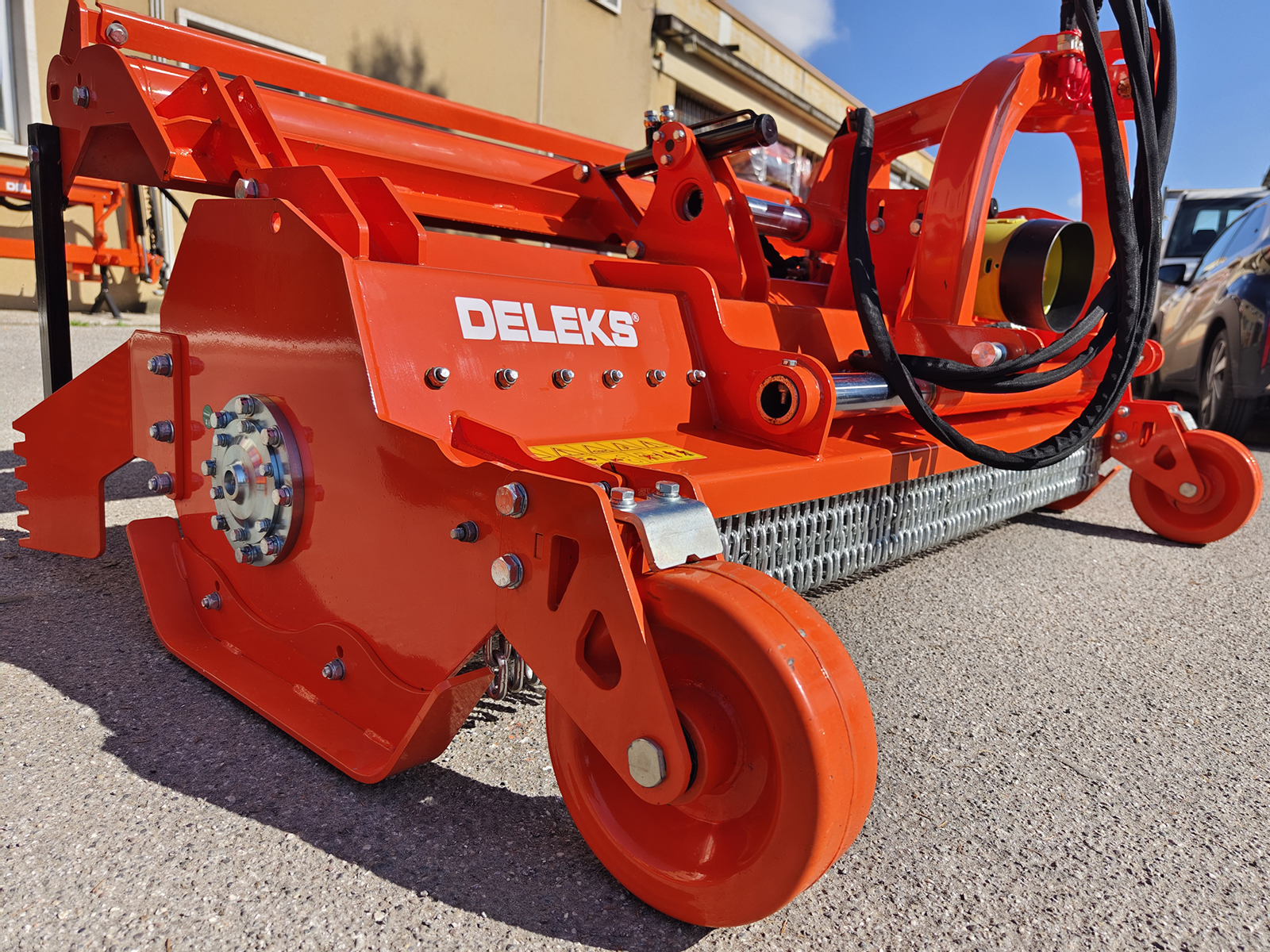 Trinciasarmenti serie pesante DELEKS® GORILLA-200 ideale per la trinciatura su residui di potatura di vigneto, frutteto, oliveto e materiale legnoso boschivo fino a Ø 15 cm. Spostamento idraulico e cardano con bullone di sicurezza.