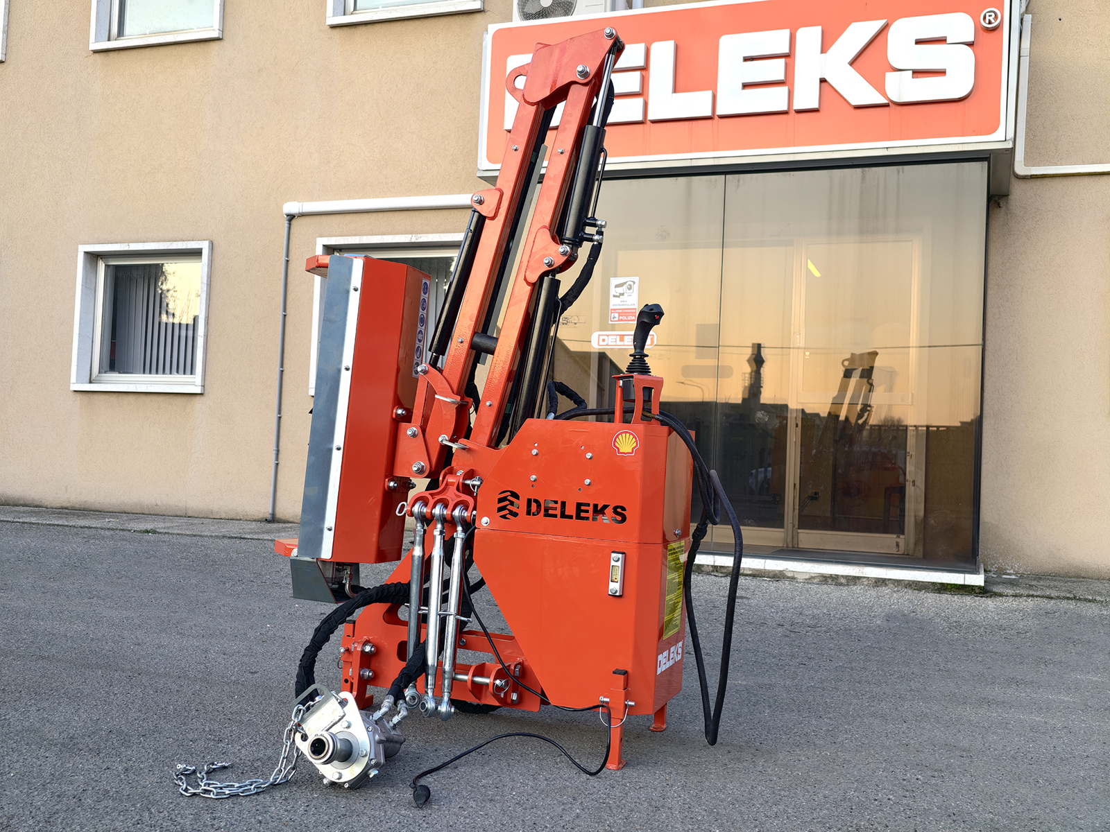 Braccio decespugliatore idraulico portato DELEKS® AIRONE, compatibile con trattori con sollevamento a 3 punti Cat. 1, predisposto per testate trincianti da 60–80–100 cm o barre tosasiepi da 130–160–180 cm. Joystick di comando e pompa PTO inclusa.