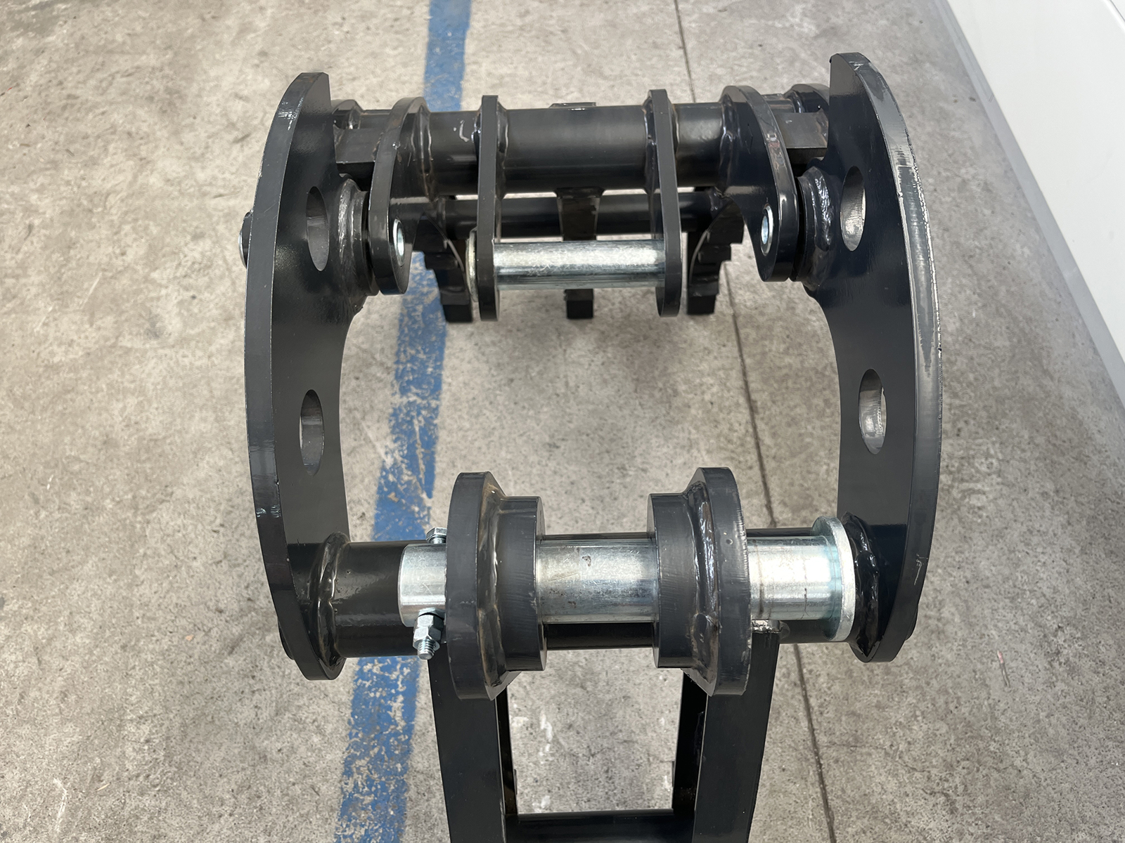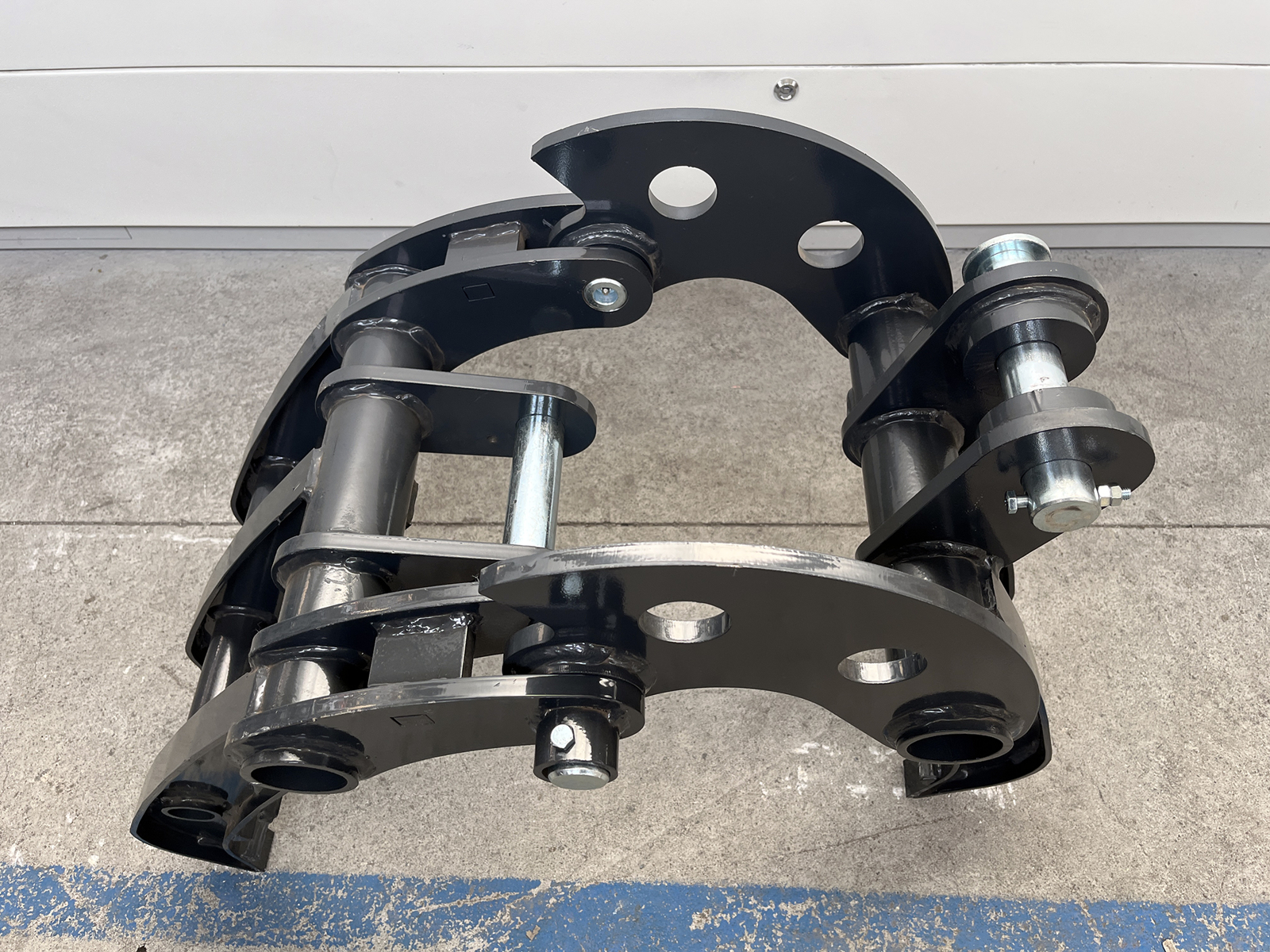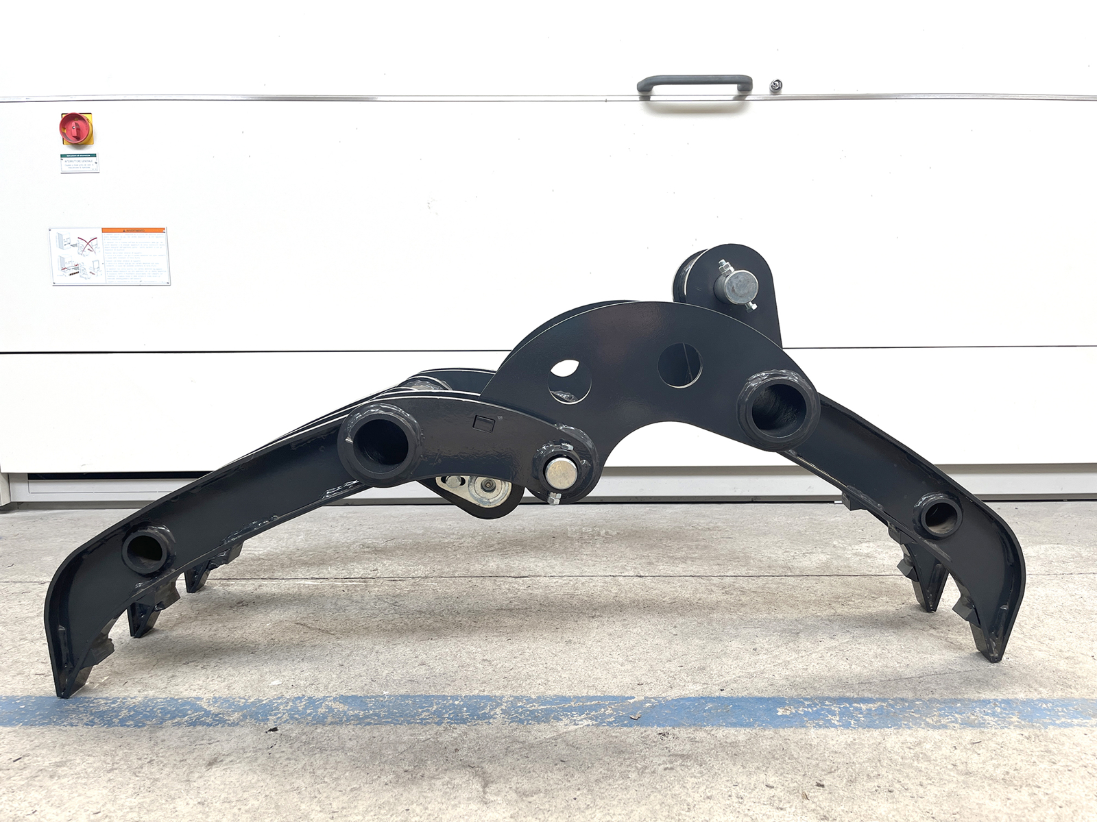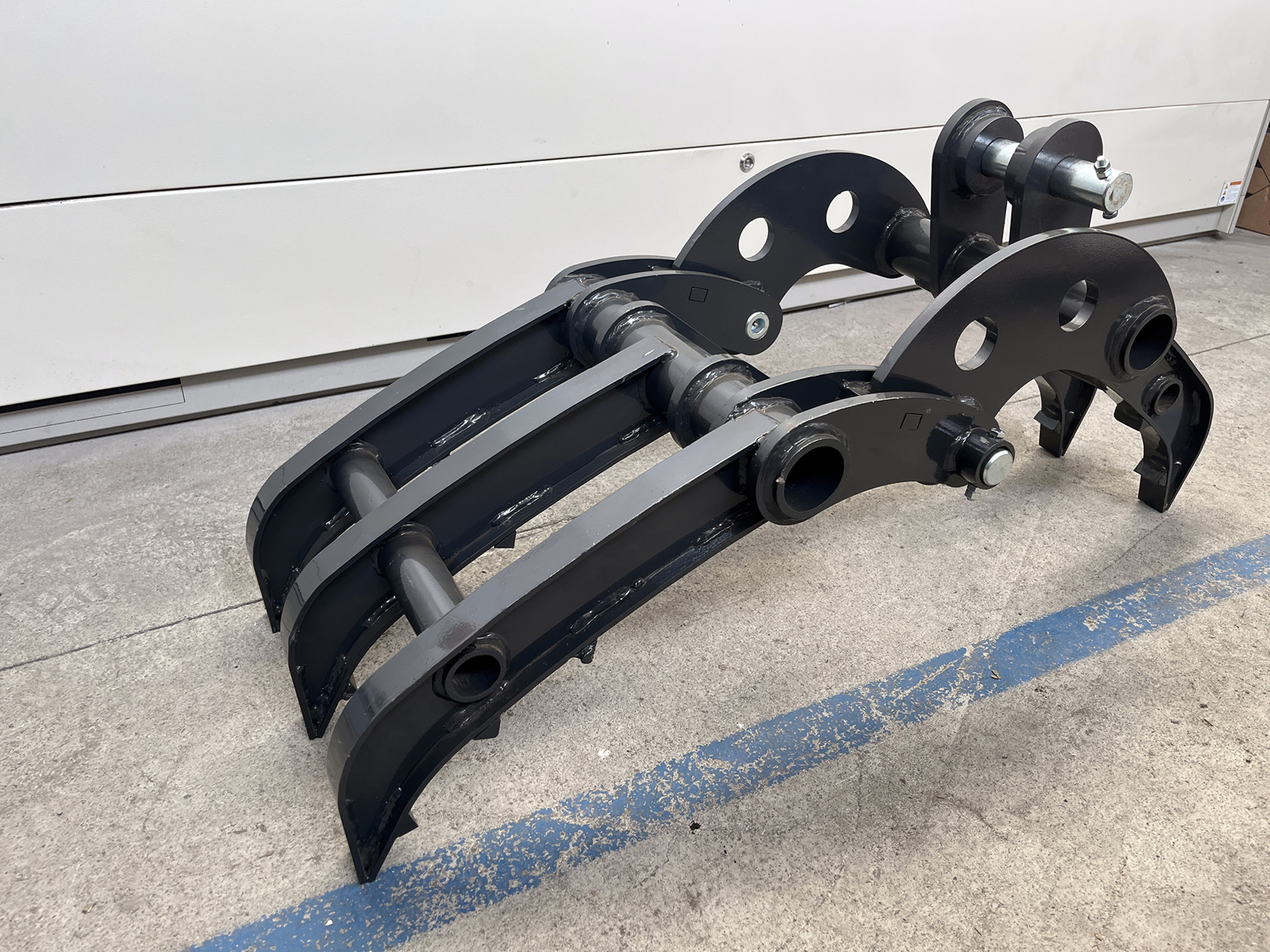 Pinza per miniescavatori S380, costruita in acciaio strutturale ad alta resistenza, con cinematismo a singolo attuatore e ganasce sagomate per la presa di materiali compatti. Il collegamento al braccio avviene tramite 2 perni Ø40 mm con ingrassatore oppure mediante attacco rapido meccanico S380. Progettata per garantire elevata rigidità torsionale e resistenza alle sollecitazioni derivanti dalla movimentazione di carichi irregolari.