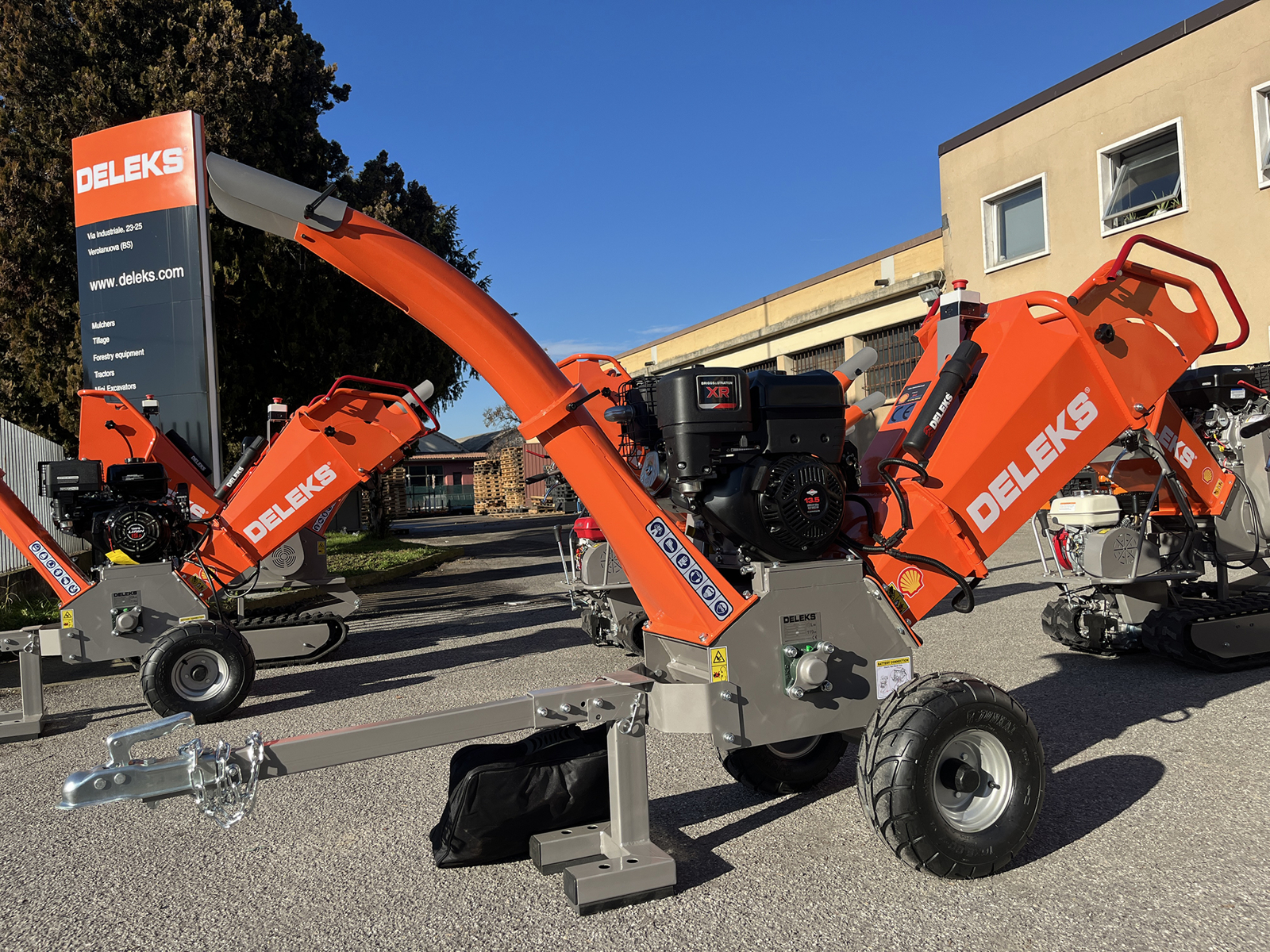 Biotrituratore DELEKS con motore indipendente BRIGGS&STRATTON 13.5 cv a benzina, 4 tempi, Avviamento elettrico, Sistema di cippatura a tamburo  con 2 coltelli orizzontali + controcoltello fisso.  Adatto alla cippatura di tutti i tipi di legno secco e verde, residui di potatura, foglie di palma, ecc. Produce cippato di dimensioni abbastanza regolari nell’ordine di 1cmq (dipende dal tipo di materiale trinciato). Protezioni antinfortunistiche CE, Conformità CE, Garanzia 2 anni.