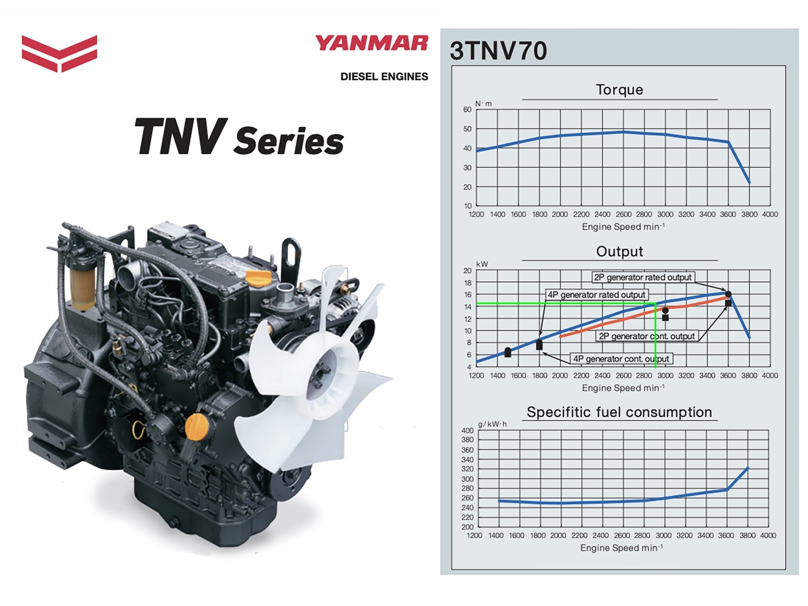 Motore diesel Yanmar 3TNV70-SSY - 3 cilindri - che eroga una potenza di 19 cv (14.2 Kw) ad un regime di 2900 g/min.