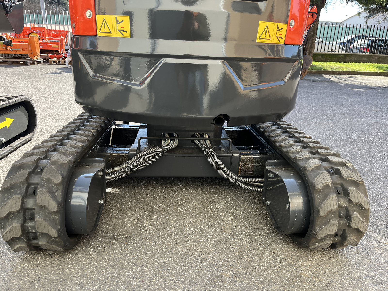 La pittaforma realizza un giro di 360 gradi e la parte posteriore non sporge oltre la larghezza dei cingoli.